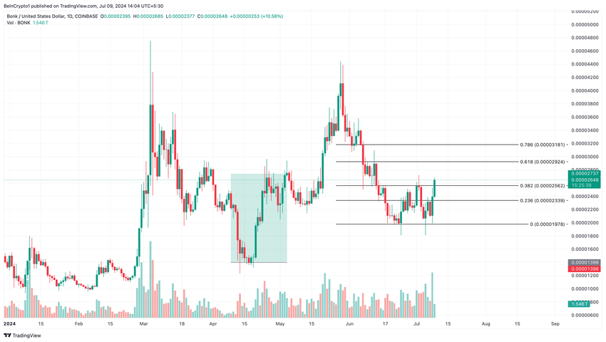Collettivamente, l’RSI e il CMF indicano che il prezzo di BONK ha più spazio per crescere. Un’ulteriore valutazione del grafico mostra che BONK sembra rispecchiare il rendimento del prezzo di aprile. Si tratta di un periodo simile a quello in cui è stato bruciato.