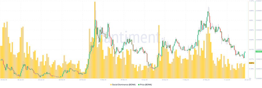 Storicamente, l’aumento della dominanza sociale fa presagire un aumento del prezzo del token. Ad esempio, quando BONK ha raggiunto un massimo storico (ATH) di 0,000047 dollari a marzo, la metrica è salita all’1,09%. Il mese scorso, la lettura della metrica si è impennata allo 0,73%, con il prezzo salito a 0,000042 dollari.