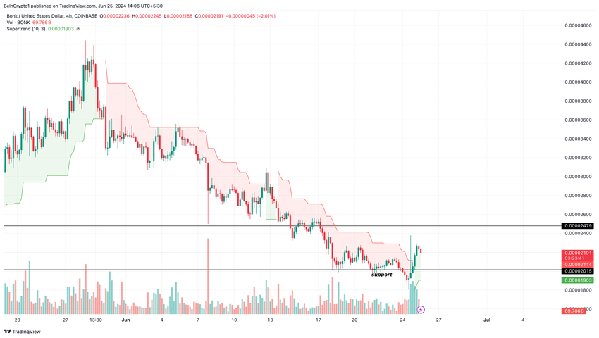 Nonostante ciò, l’analisi del grafico a 4 ore di BONK/USD suggerisce un’ulteriore salita del token. La Supertrend guida questa previsione.