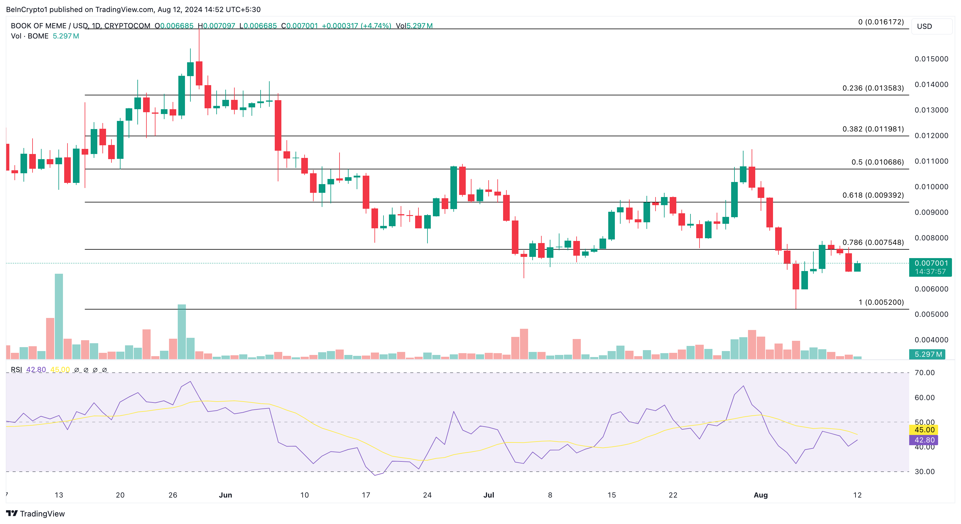Nonostante la sua rapida ascesa a 1 miliardo di dollari di market cap, Bookof Meme (BOME) è ora l’ombra di se stessa. Al momento della stampa, l’altcoin scambia a 0,0070 dollari.