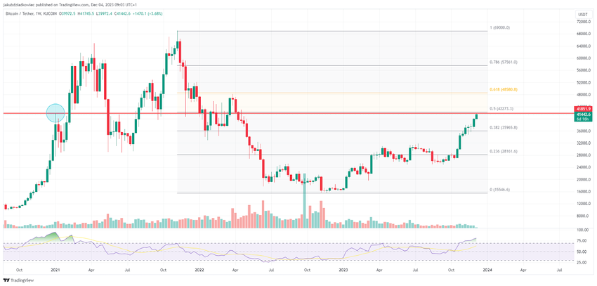 Il prezzo del BTC è in rapida ascesa da metà ottobre 2023. In un periodo di 7 settimane, il Bitcoin è passato da 27.000 dollari a un’area appena inferiore a 42.000 dollari. Si tratta di un movimento al rialzo del 55%.