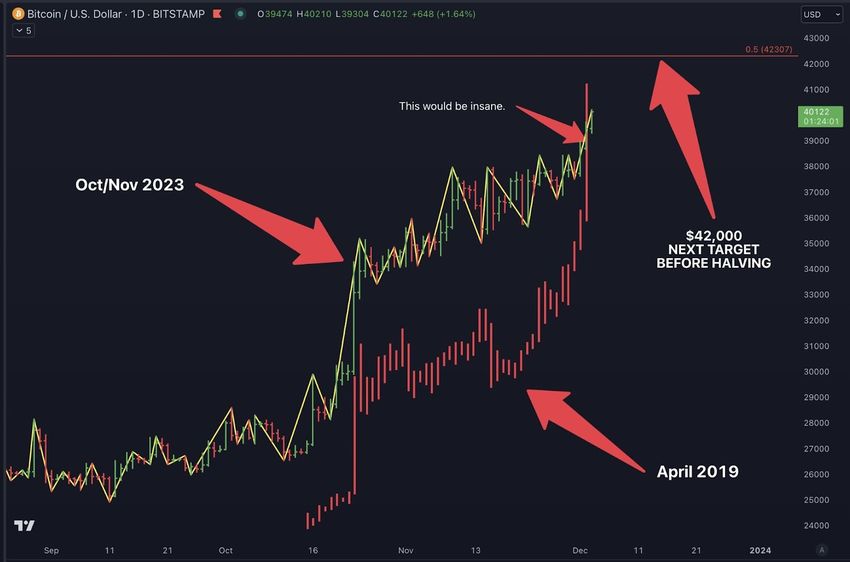Inoltre, confronta l’attuale azione dei prezzi con il frattale del movimento parabolico dell’aprile 2019. A suo avviso, il livello di 42.000 dollari è un obiettivo a lungo termine che fungerà da resistenza prima del dimezzamento del prossimo anno.