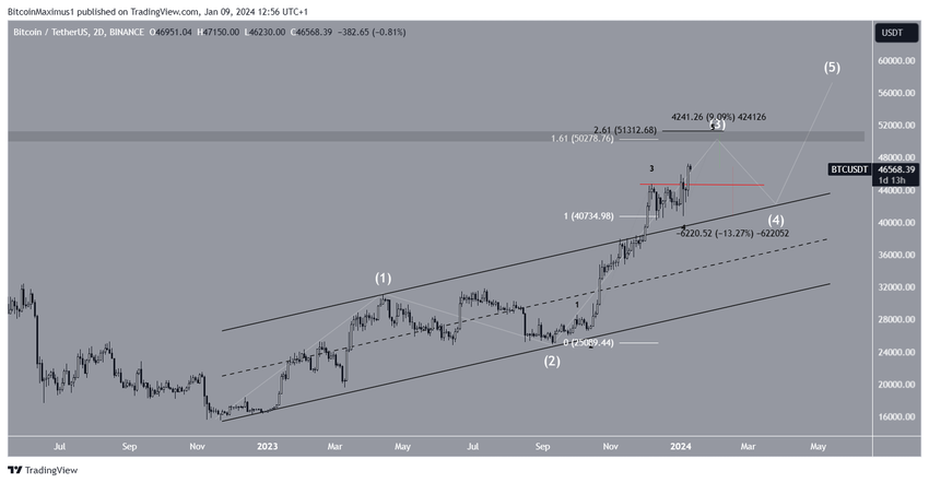 Nonostante questa previsione rialzista sul prezzo del BTC, un calo al di sotto del massimo della sotto-onda tre (in rosso) a 44.700 dollari significherà che il prezzo ha raggiunto il top. A quel punto, il BTC potrebbe scendere del 13% fino alla linea di tendenza di resistenza del canale precedente a 41.000 dollari.