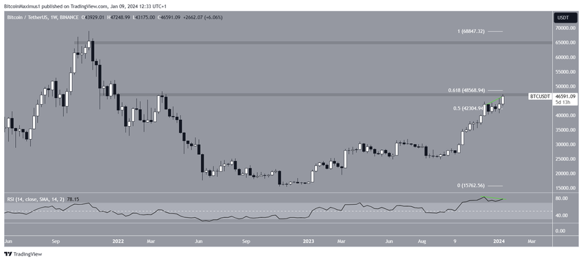 Il grafico settimanale mostra che il prezzo del BTC è aumentato dall’inizio dell’anno. Il movimento al rialzo ha portato a un massimo di 47.248 dollari oggi.