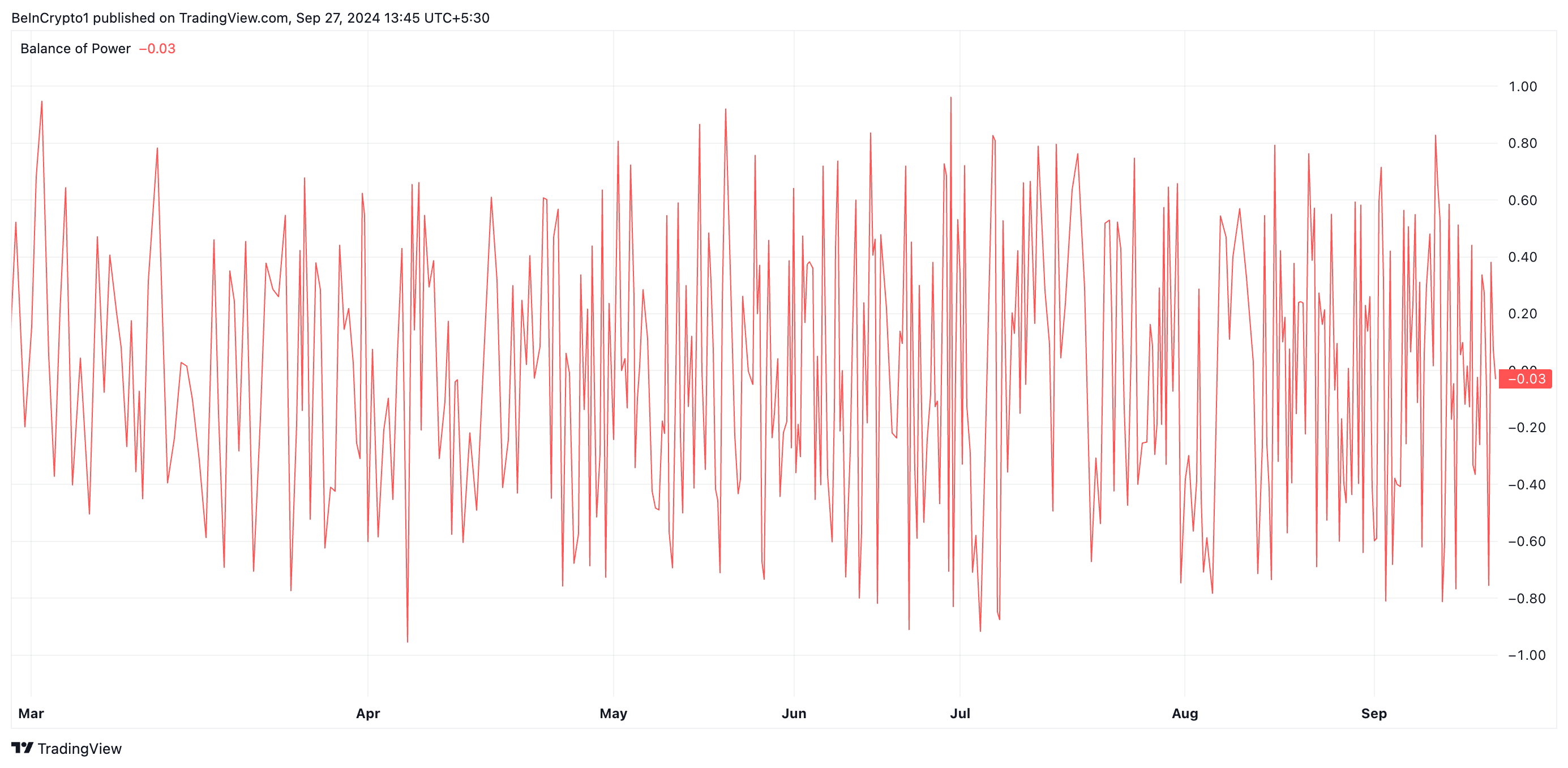 L’indicatore negativo del Bilancio di Potere (BoP) supporta questa prospettiva. Questo indicatore, che misura la forza degli acquirenti rispetto ai venditori in un dato mercato durante un periodo specifico, è sotto zero al momento, a -0,03. I venditori hanno più controllo sul mercato quando il BoP di un asset è negativo.