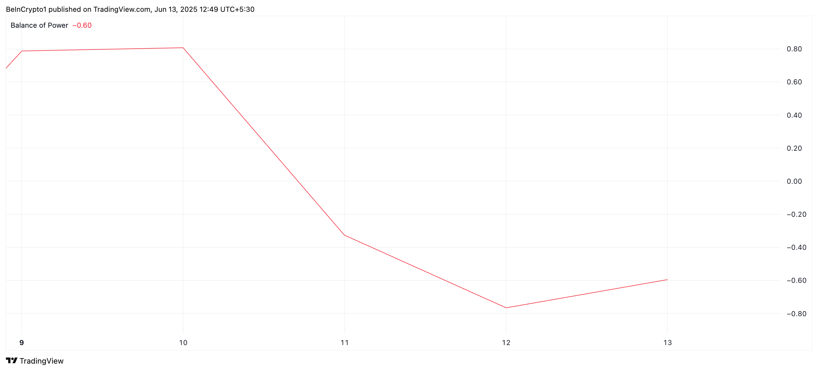 L’indicatore BoP misura la forza degli acquirenti rispetto ai venditori nel mercato. Una lettura BoP negativa suggerisce che la pressione di vendita domina, indicando una mancanza di nuova domanda e una maggiore probabilità di un continuo calo del prezzo.