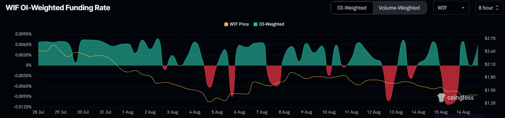 Il prezzo di WIF scambia attualmente a 1,39 dollari, segnando un ribasso del 27% negli ultimi sette giorni. Questo ribasso ha quasi cancellato il rialzo del 51% osservato in tre giorni nella fase iniziale di agosto. A seguito di questo calo, il memecoin ha perso il potenziale di rialzo.