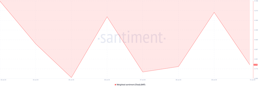 Sebbene gli operatori di mercato non siano sicuri della prossima direzione del prezzo di WIF, il memecoin non è ancora obiettivo di un significativo orientamento ribassista. Al momento della stesura di questo articolo, il sentimento ponderato dell’altcoin è pari a -0,74.