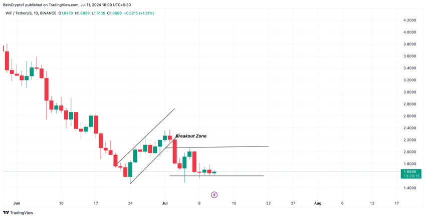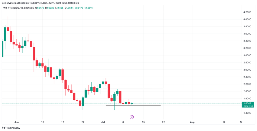 Dogwifhat (WIF) ha rotto la linea inferiore del suo canale ascendente il 3 luglio e da allora ha avuto una tendenza all’interno di una fascia.