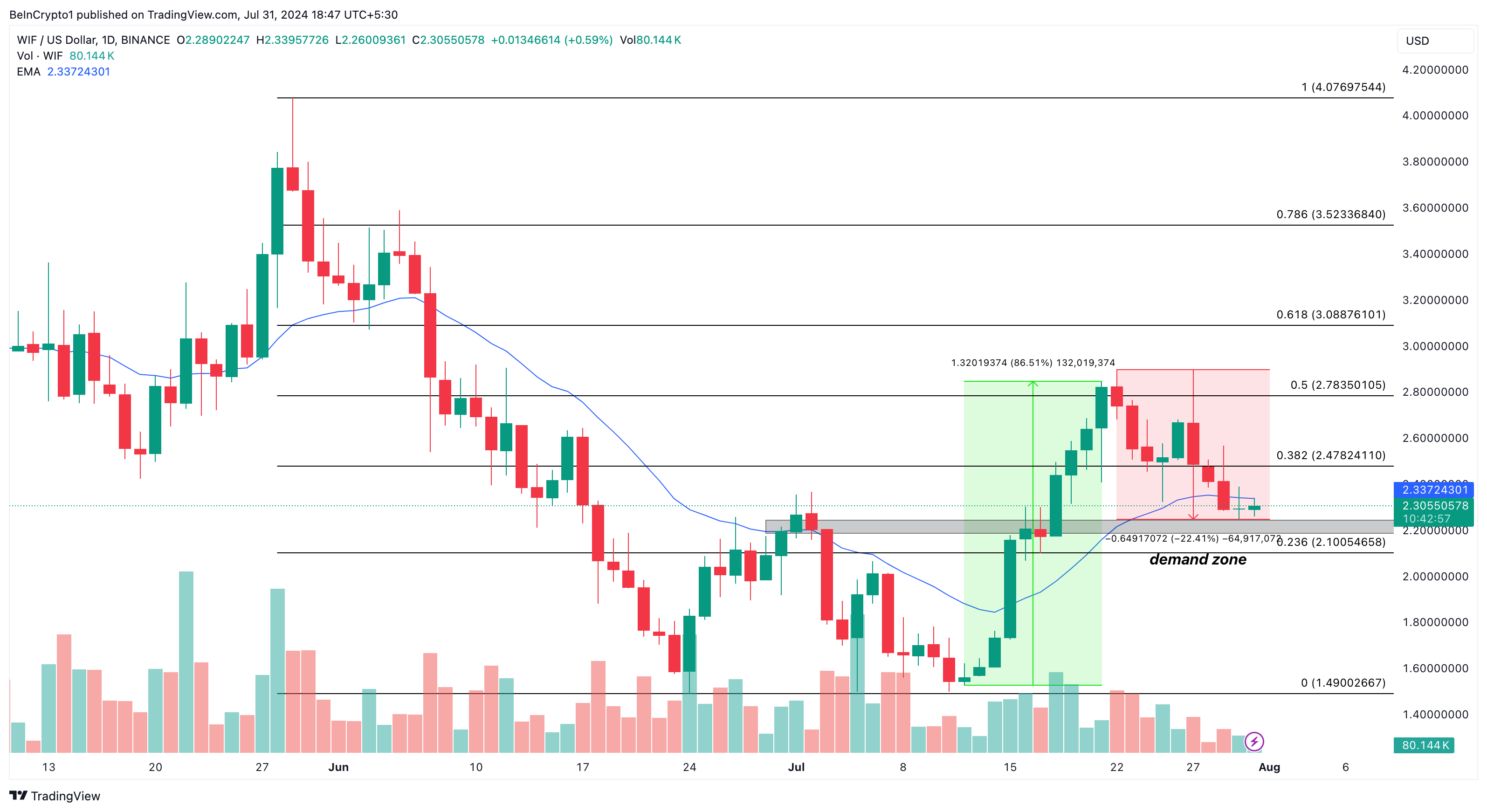 Sulla base del grafico giornaliero WIF/USD, il memecoin ha cancellato quasi la metà dei guadagni di luglio. Mentre il prezzo scende, si sta avvicinando a una zona di domanda cruciale situata tra 2,14 e 2,20 dollari.