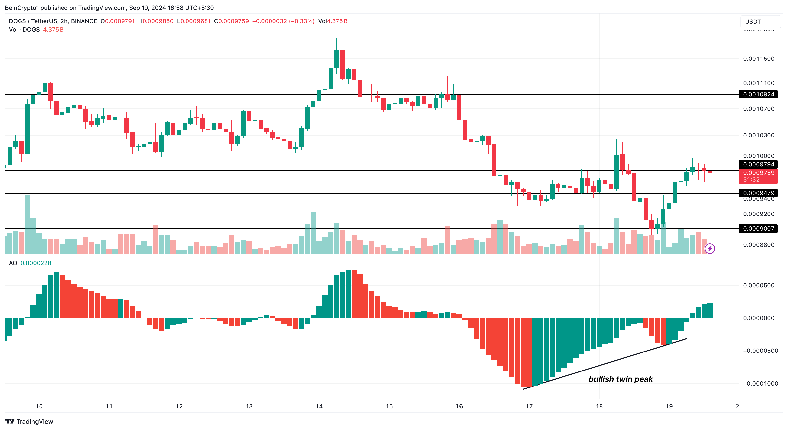 Inoltre, la formazione del picco ha spinto la lettura dell’AO in regione positiva, suggerendo un continuo momento rialzista per DOGS. Lo stesso intervallo di tempo mostra anche che la criptovaluta affronta una resistenza a 0,00097 USD.