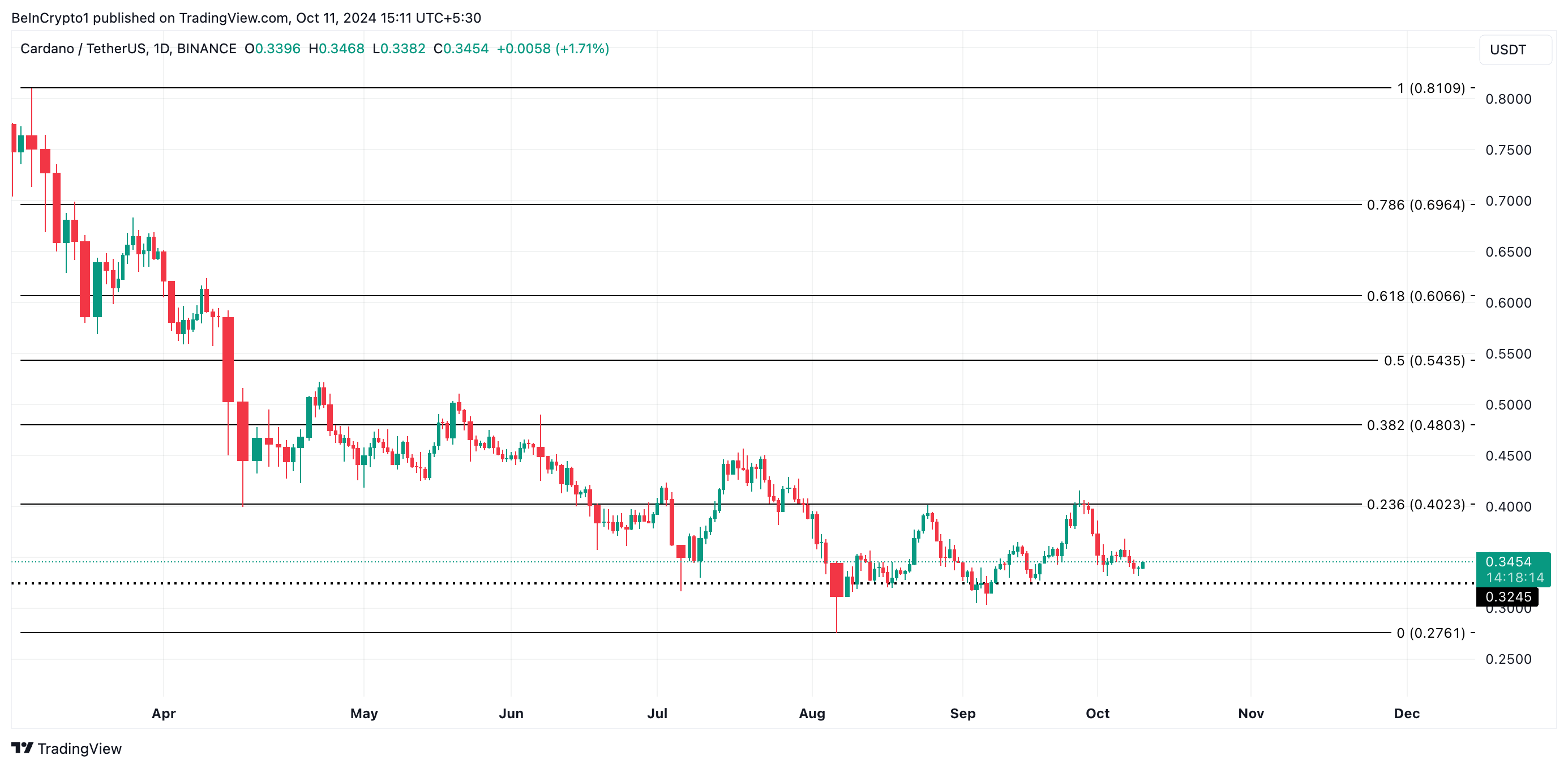 Cardano (ADA) è in tendenza negativa dal 27 settembre, attualmente scambiato a 0,34 USD, con un calo del 15%. La criptovaluta, undicesima per capitalizzazione di mercato, si trova vicino a un livello di supporto critico a 0,32 USD.