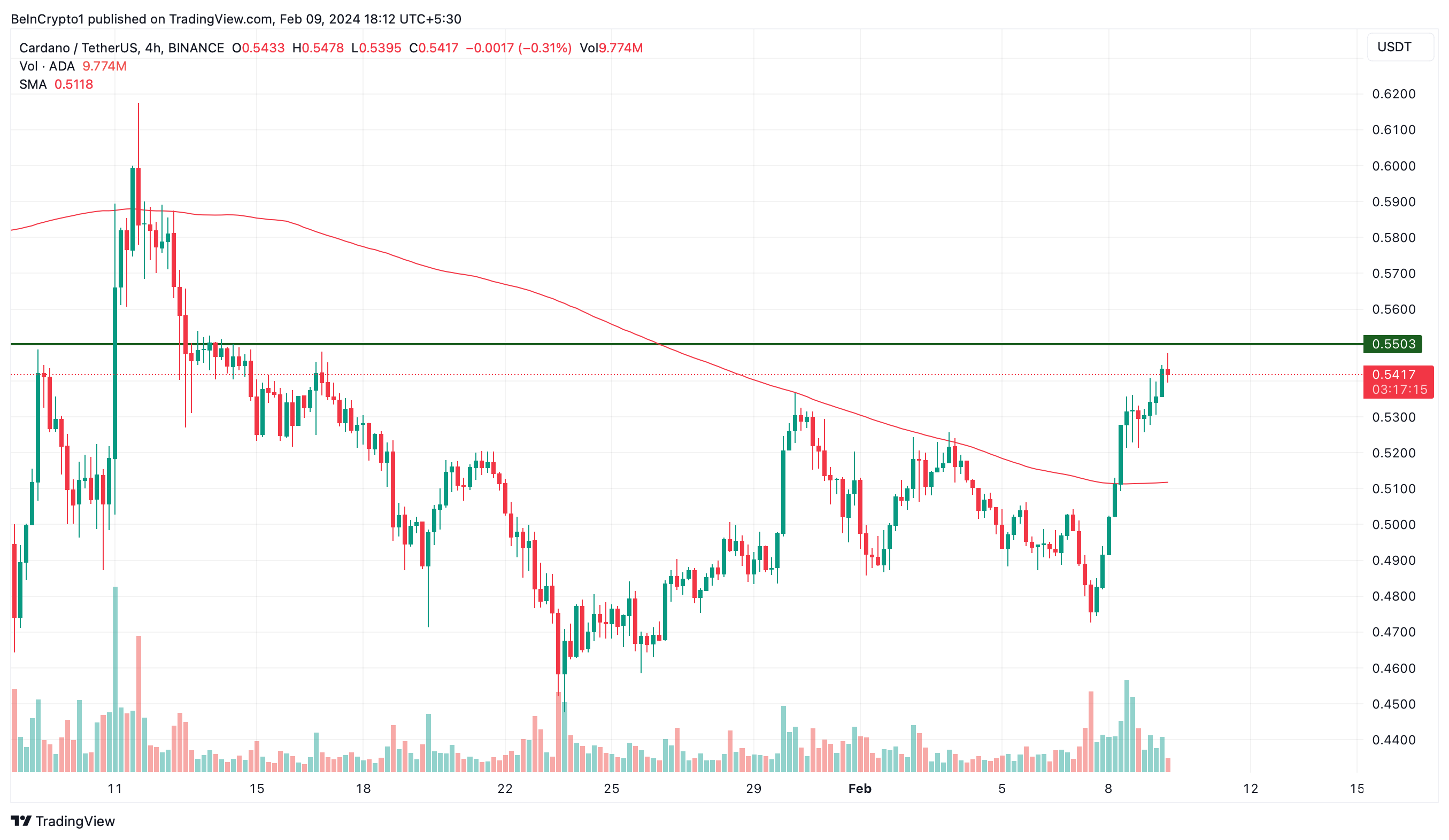 “ADA vedrà molto probabilmente un retest dell’area di resistenza di $0,55 oggi. Questo sarà un punto critico e determinerà se ADA potrà salire”, ha spiegato.