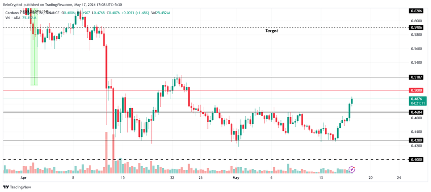Il prezzo di Cardano, scambiato a 0,48$ al momento della scrittura, ha superato la resistenza a 0,46$. Quest’ultima ha consolidato l’altcoin e un breakout da essa ha aumentato le speranze di un aumento a 0,50$.