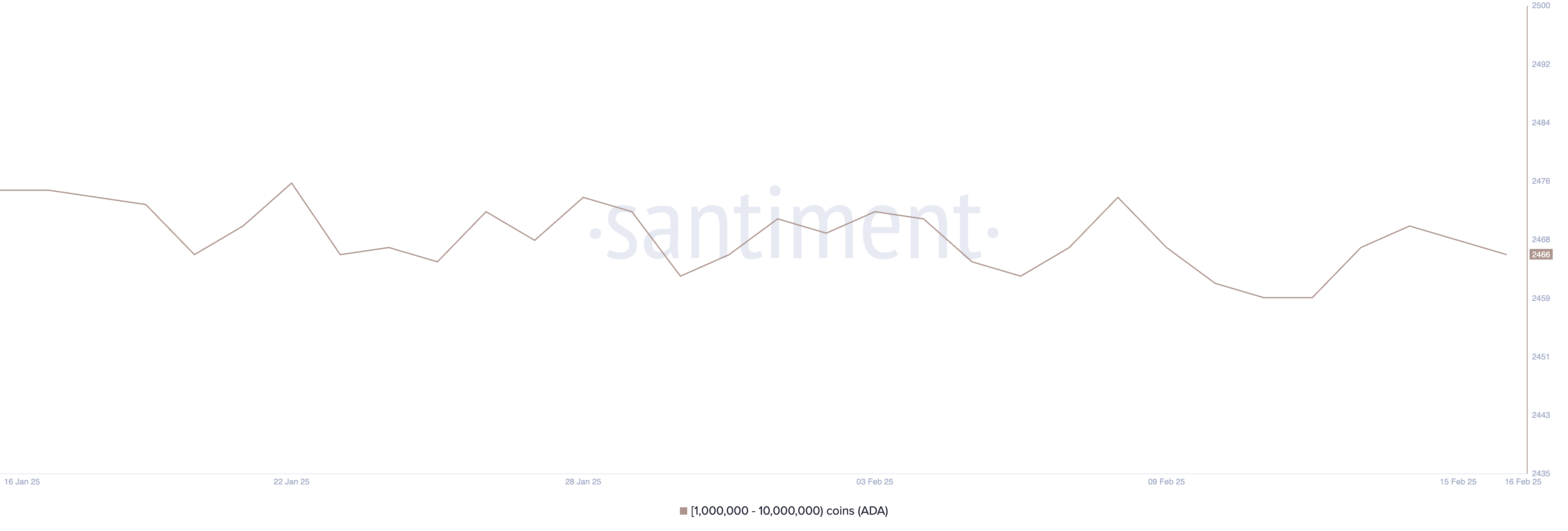 Il numero di balene di Cardano – indirizzi che detengono tra 1 milione e 10 milioni di ADA – attualmente è di 2.466 ed è rimasto relativamente stabile nelle ultime settimane.