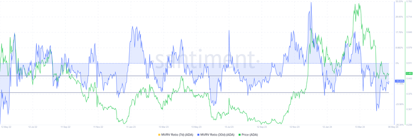 L’MVRV a 30 giorni di Cardano si trova a -10,24%, segnalando perdite e potenzialmente spingendo all’accumulo. Storicamente, il recupero dell’ADA si verifica all’interno dell’intervallo MVRV -7% e -17%, etichettandolo come zona di opportunità di accumulo.