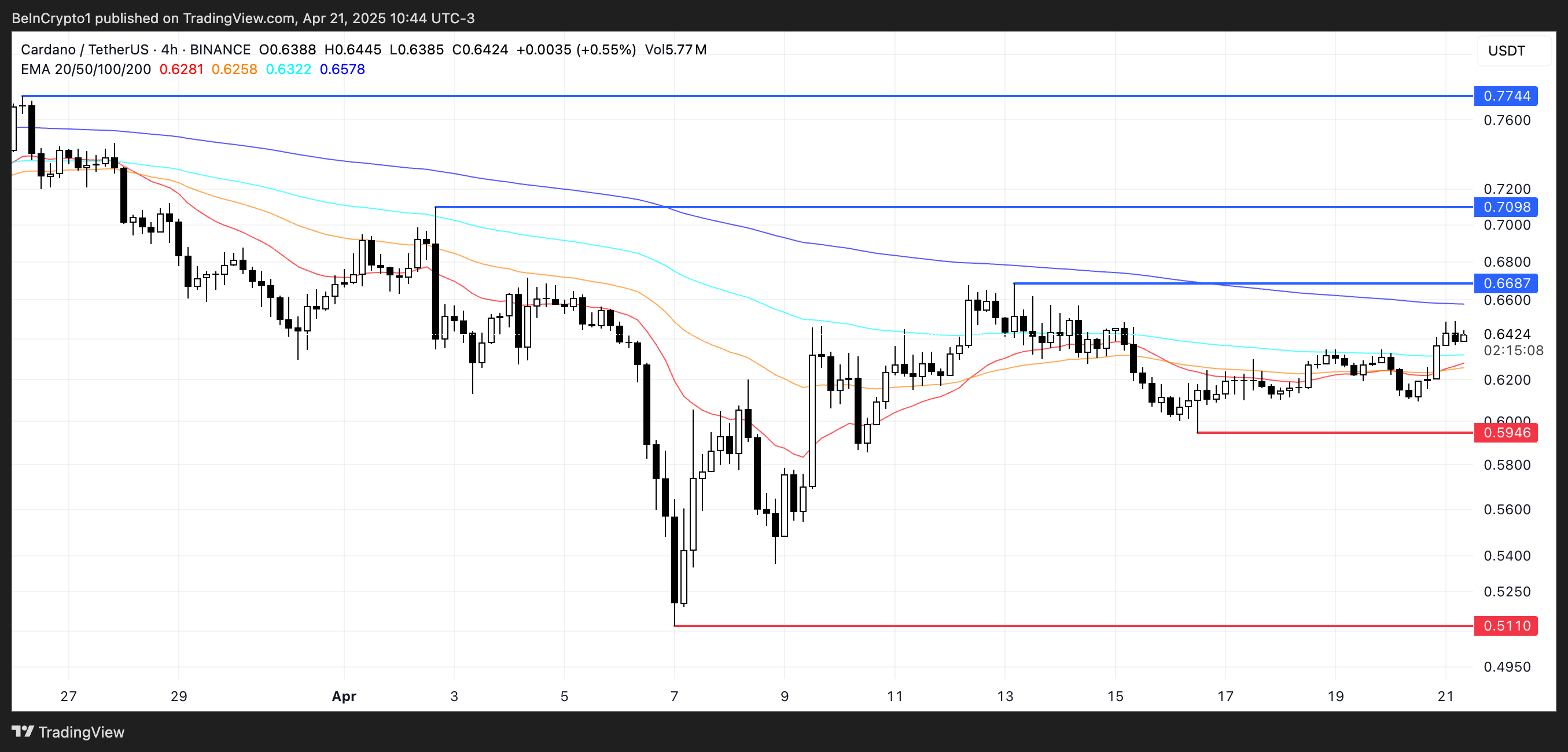 Se questo crossover venisse confermato e ADA riuscisse a superare la resistenza a $0,668, le previsioni sul prezzo di Cardano indicano i prossimi obiettivi al rialzo a $0,709 e $0,77—livelli che non si registrano dalla fine di marzo.