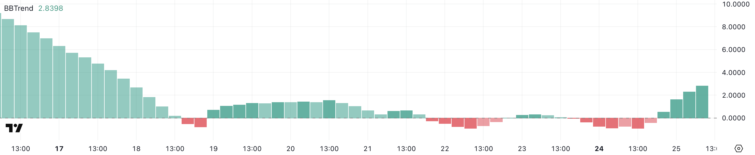 Il BBTrend di ADA è attualmente a 2,83, in aumento da -0,90 solo un giorno fa, indicando un cambiamento nel momentum. Il BBTrend è un indicatore derivato dalle Bande di Bollinger che misura la forza e la direzione di un trend.