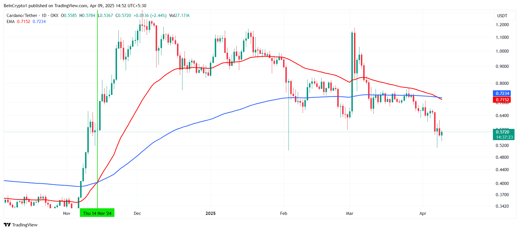 Attualmente, Cardano sta vivendo la formazione di una Death Cross, che segna un cambiamento significativo nel sentiment di mercato. La media mobile esponenziale (EMA) a 200 giorni ha recentemente incrociato l’EMA a 50 giorni, segnalando la fine del momentum rialzista di cinque mesi dell’altcoin.