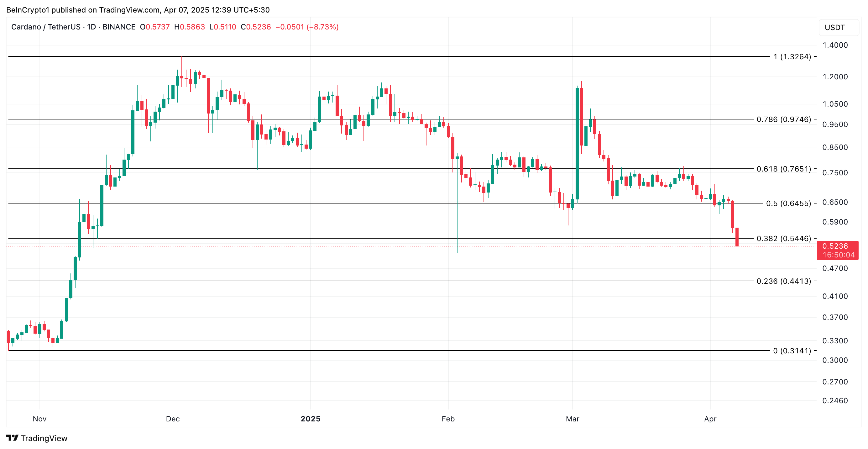 ADA è ora scambiato a $0,52, livelli visti l’ultima volta a novembre 2024. Questo rafforza il crescente sentimento ribassista contro l’altcoin.