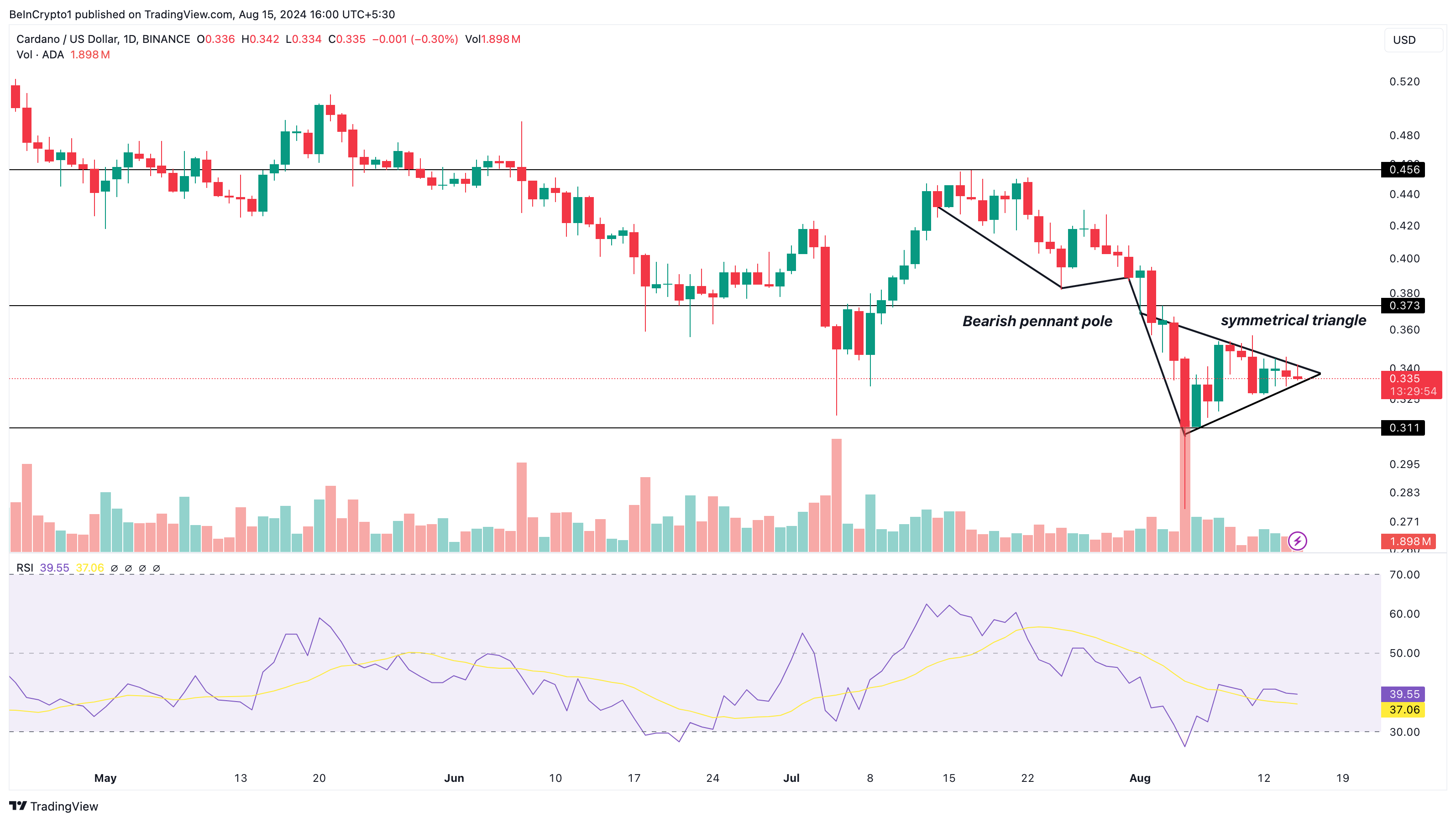 Da una prospettiva a breve termine, ADA ha formato un pennant ribassista tra metà luglio e inizio agosto. Questo schema è caratterizzato da un forte calo dei prezzi seguito da un consolidamento all’interno di un triangolo simmetrico sul grafico giornaliero.