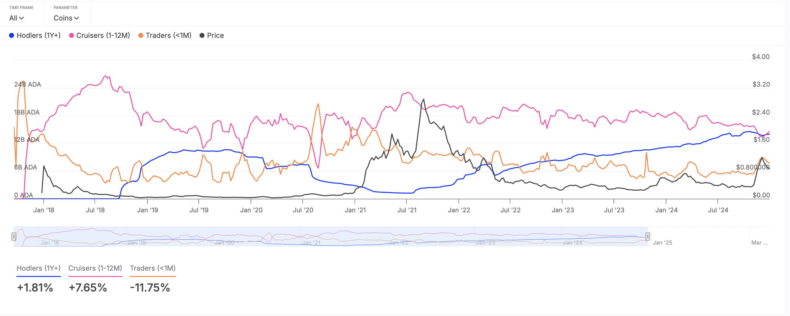 Gli STH, termine che si riferisce agli investitori che tipicamente detengono asset per meno di un mese, hanno ridotto significativamente il loro tempo di detenzione di ADA mentre il sentiment ribassista si intensifica nel mercato crypto.