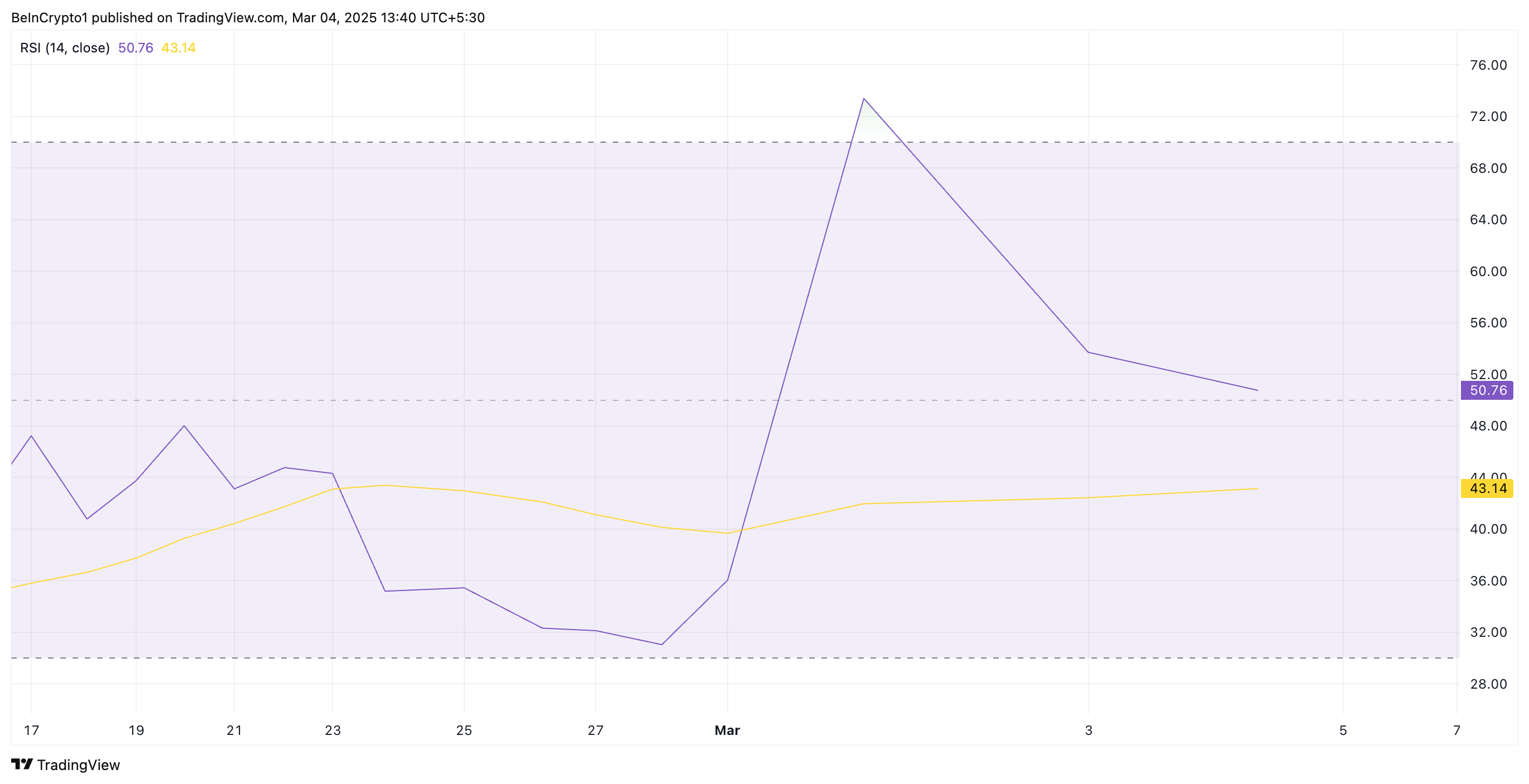 Quando il prezzo di un asset sta per scendere sotto la sua EMA a 20 giorni, segnala un indebolimento del momentum a breve termine. Una rottura confermata sotto il livello indica un’inversione di trend ribassista e mette in evidenza l’aumentata pressione di vendita nel mercato. Pertanto, una rottura sotto questo livello chiave metterebbe ADA a rischio di estendere il suo declino nel breve termine.