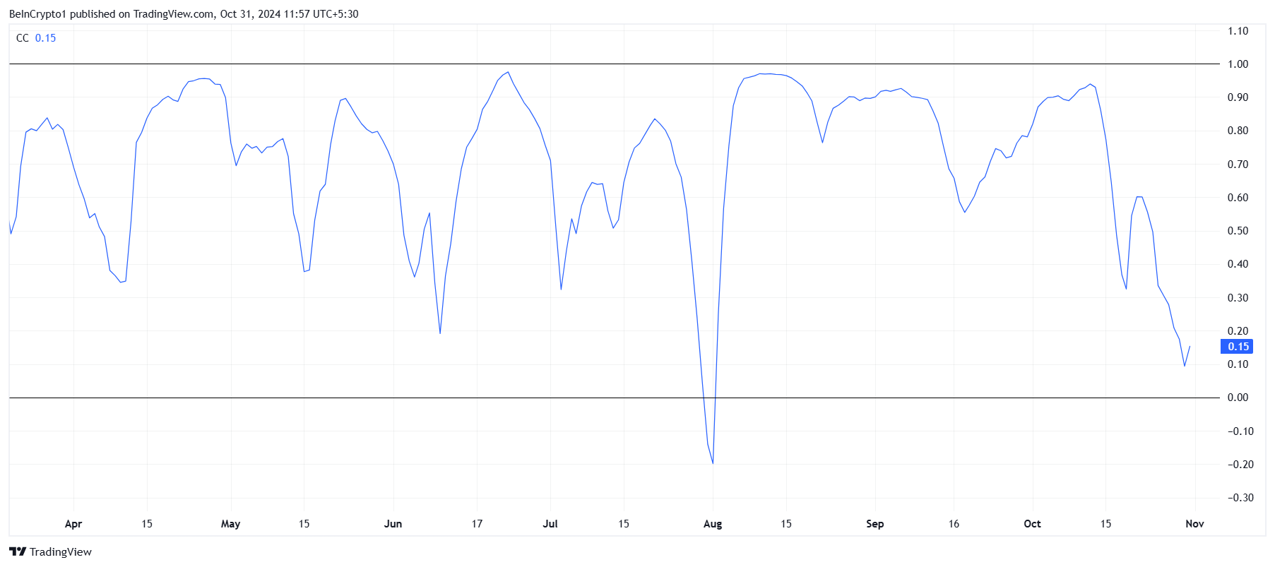 La correlazione di Cardano con Bitcoin è in calo graduale, ora si attesta a 0,15. Questa bassa correlazione implica che ADA potrebbe non beneficiare dei movimenti di prezzo di Bitcoin, che storicamente influenzano le tendenze delle altcoin. Per Cardano, questa divergenza potrebbe essere problematica, poiché il momento di rally di Bitcoin spesso supporta la crescita delle altcoin.