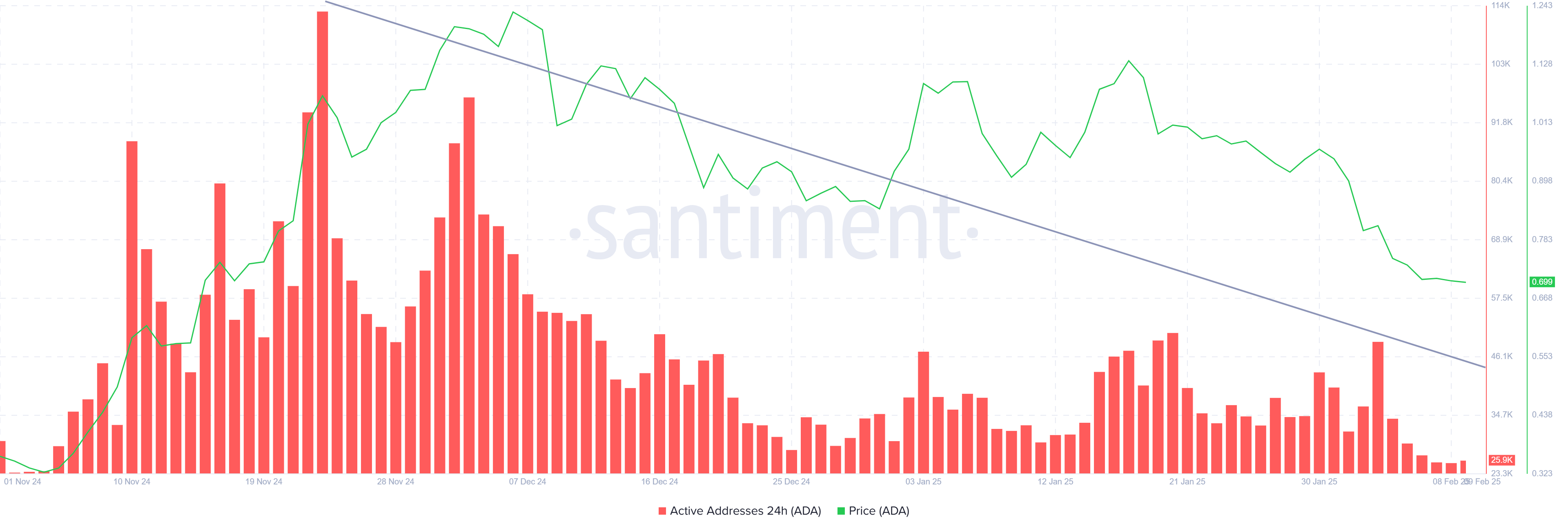 Da novembre 2024, il trend è stato costante, con meno partecipanti che interagiscono con la rete. Questo declino segnala un indebolimento della domanda, che potrebbe ulteriormente contribuire alle difficoltà di ADA.