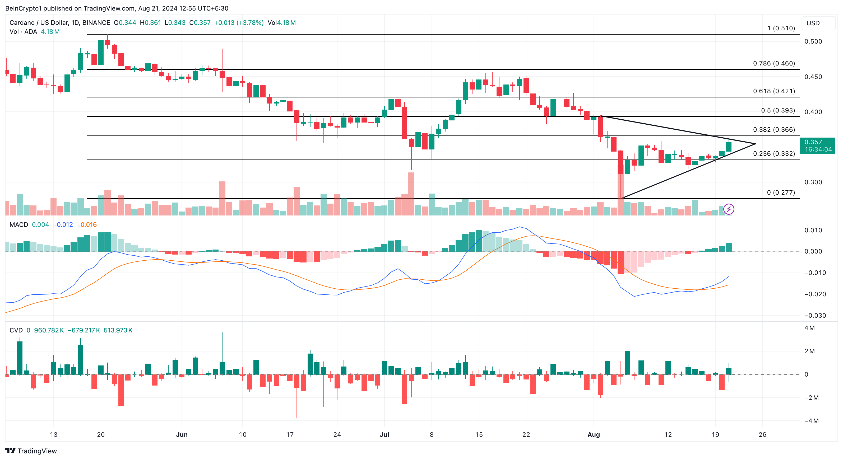 Se mantenuto, il prezzo di ADA potrebbe presto raggiungere 0,36 dollari. Questa prospettiva è supportata anche dall’indicatore Moving Average Convergence Divergence (MACD), che traccia lo slancio. Attualmente la lettura del MACD è positiva e indica che ADA sta vivendo uno slancio rialzista.