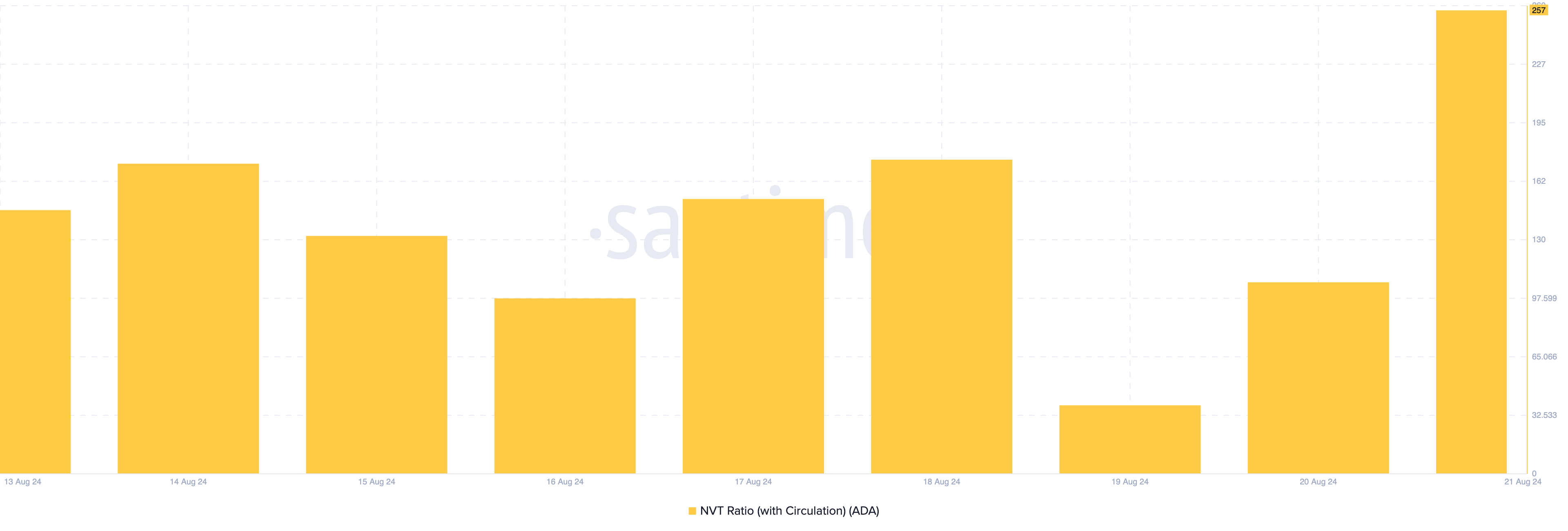 Nonostante l’attuale prezzo dell’ADA, i dati sul blockchain rivelano che potrebbe essere ingiustificatamente gonfiato. Ciò è dovuto alle indicazioni del rapporto Network Value to Transaction (NVT), che mostra se il market cap di una criptovaluta sta superando il volume delle transazioni.