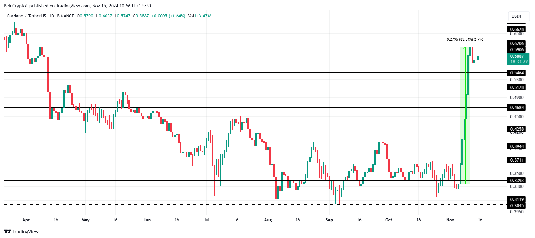 Se il slancio rialzista continua, ADA potrebbe salire a 0,62 USD. Superare questo livello potrebbe aprire la strada a Cardano per puntare a 0,66 USD, consolidando ulteriormente la sua posizione nel mercato.