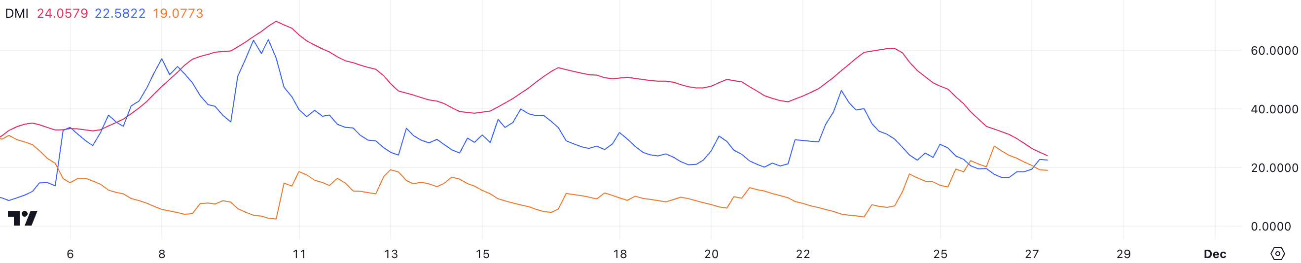 Cardano il grafico DMI mostra il suo ADX a 24, un calo notevole da 60 solo pochi giorni fa. L’ADX, o Average Directional Index, misura la forza di un trend, indipendentemente dalla direzione, con valori sopra 25 che indicano un trend forte e valori sotto 20 che suggeriscono debole slancio.