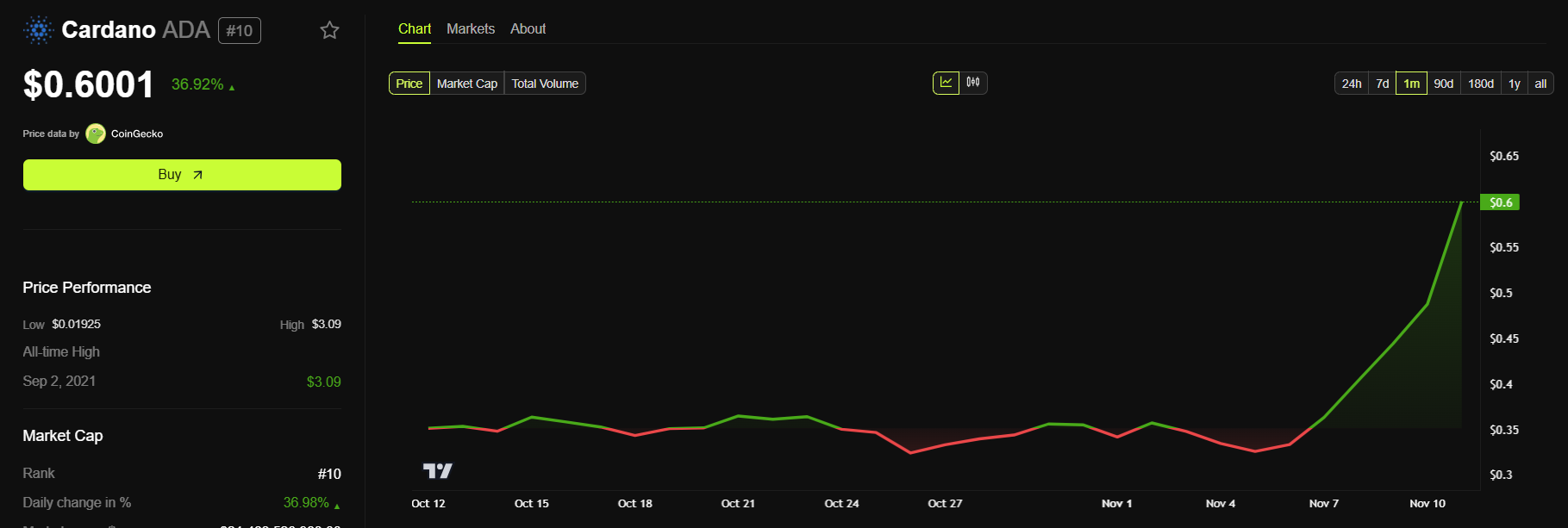 Le notizie sui piani di Hoskinson di collaborare con i funzionari statunitensi hanno coinciso con un aumento del valore di ADA. Nelle ultime 24 ore, il token ADA è aumentato di oltre il 36%, raggiungendo oltre 0,60 USD — il suo livello di prezzo più alto da aprile — secondo i dati di BeInCrypto.