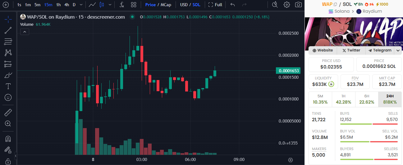 WAP, un memecoin basato su Solana, ha un’offerta totale di 1 miliardo di token. Secondo Dexscreener, WAP ha attualmente un prezzo di circa 0,00016 SOL, con una capitalizzazione di mercato che supera i 23 milioni USD. Il valore del token è sceso di oltre il 60% dal suo picco di 0,26 SOL.