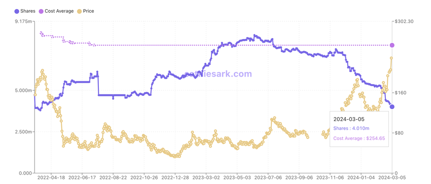 In risposta alla tendenza rialzista del mercato, Wood ha iniziato a ridurre il suo interesse in Coinbase. In particolare, la partecipazione di ARKK in Coinbase si è quasi dimezzata da ottobre 2023. Nell’ottobre 2023 l’ETF possedeva circa 7 milioni di azioni.