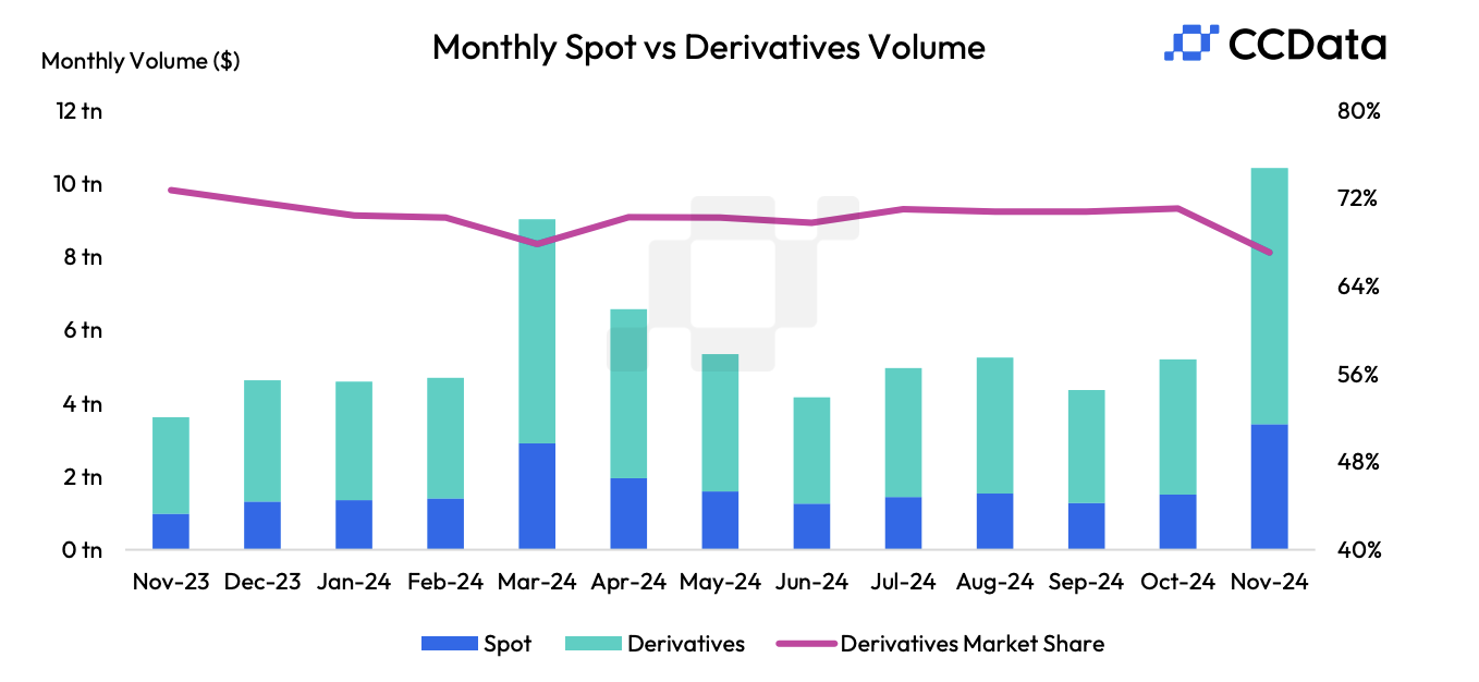 Complessivamente, il volume combinato di trading spot e derivati sugli exchange centralizzati è aumentato di oltre il 100% da ottobre a novembre. Il totale finale, secondo CCData, è stato di 10,4 trilioni USD. Questo impressionante traguardo aiuta a contestualizzare il massiccio mercato rialzista nello spazio crypto.