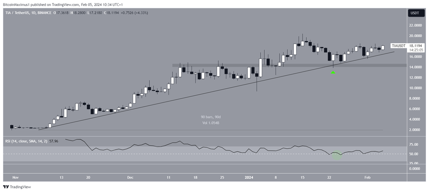 Il prezzo di Celestia (TIA) è aumentato dal 13 gennaio, convalidando una linea di tendenza ascendente di supporto a lungo termine.