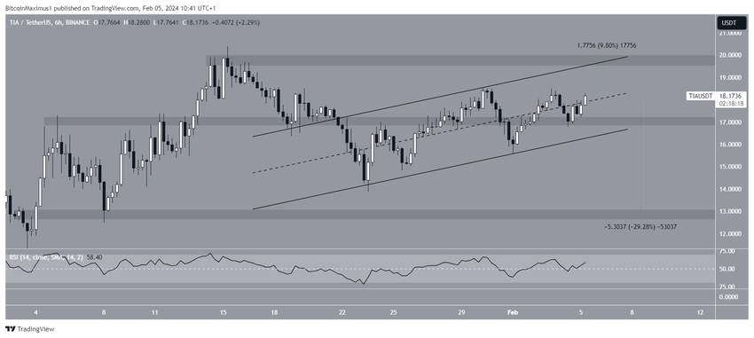 Anche l’analisi tecnica a sei ore fornisce una prospettiva rialzista. Il grafico mostra che il prezzo del TIA scambia all’interno di un canale parallelo ascendente e ha recuperato l’area orizzontale dei 17 dollari. L’area dovrebbe ora fornire supporto.