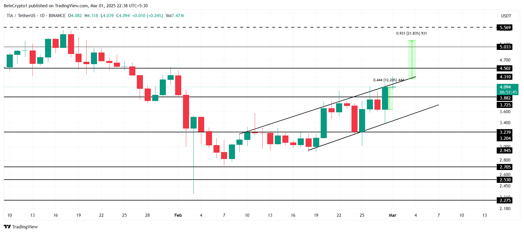 Attualmente, TIA è scambiata a $4,09, in aumento del 12% rispetto al giorno precedente e mantenendosi sopra il livello di supporto di $3,88. Muovendosi all’interno di un canale ascendente, TIA sembra pronta per un breakout. Un breakout riuscito potrebbe spingere l’altcoin del 21,8%, portando il suo prezzo sopra la soglia di $5,00, segnando un massimo di sei settimane per TIA.