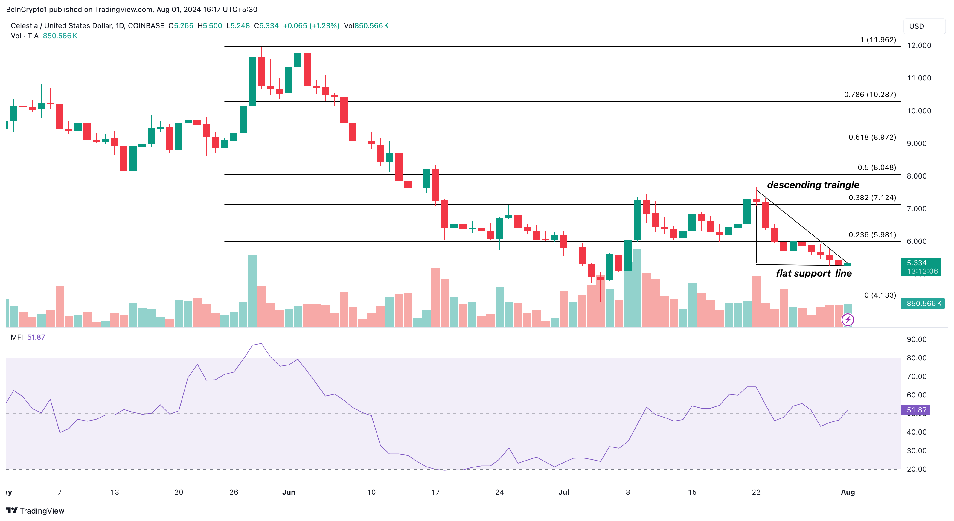 Al momento in cui scriviamo, TIA scambia all’interno di un triangolo discendente dal 22 luglio. In questo schema, il prezzo continua a toccare i massimi più bassi mentre la linea di supporto piatta si consolida intorno alla stessa area.