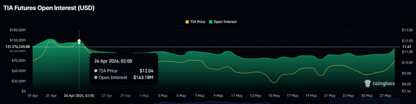 SponsoredLo stesso sentimento può essere visto tra i trader dal momento che il mercato dei futures sta registrando afflussi significativi. L’Open Interest di TIA è attualmente a un massimo mensile di 126 milioni di dollari.