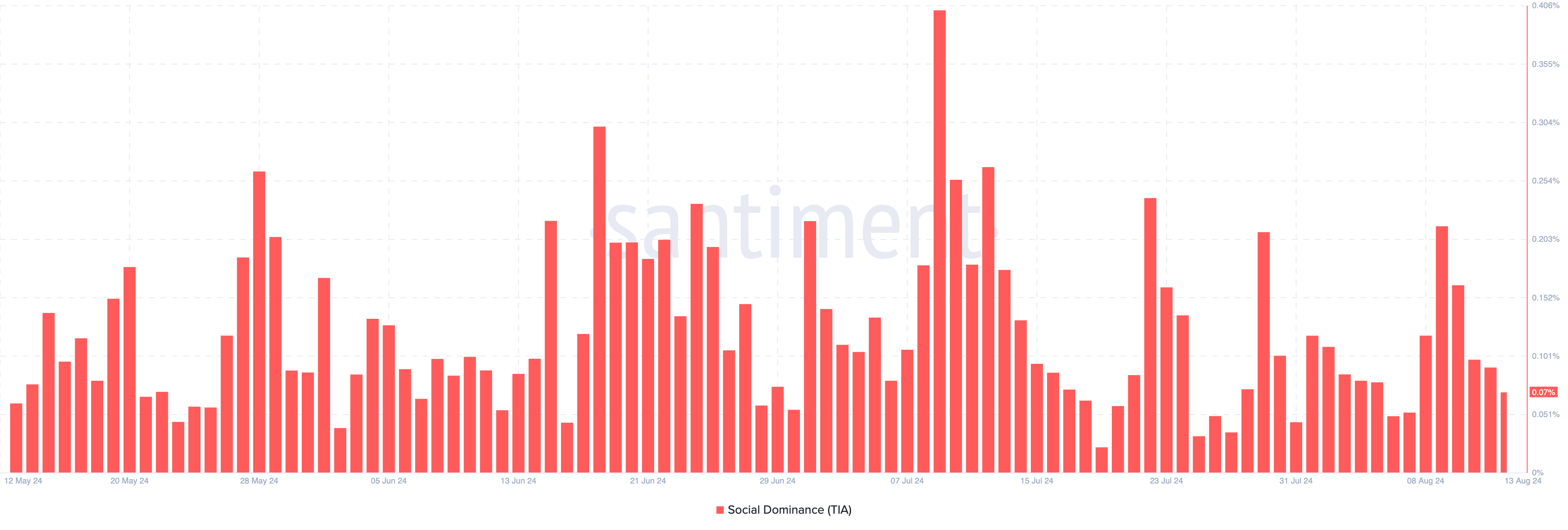 Tuttavia, al momento, il dominio sociale di TIA è sceso allo 0,07%. Se questo calo persiste, potrebbe portare a una diminuzione del prezzo di TIA.
