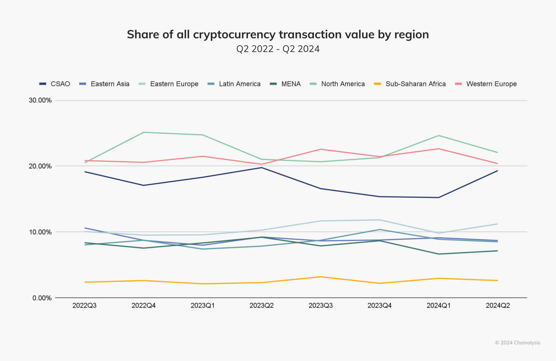 Un rapporto di Chainalysis del 2024 ha rivelato che MENA era il settimo mercato crypto più grande al mondo. Da luglio 2023 a giugno 2024, la regione ha visto $338,7 miliardi in transazioni crypto online, rappresentando il 7,5% di tutte le transazioni crypto a livello globale.