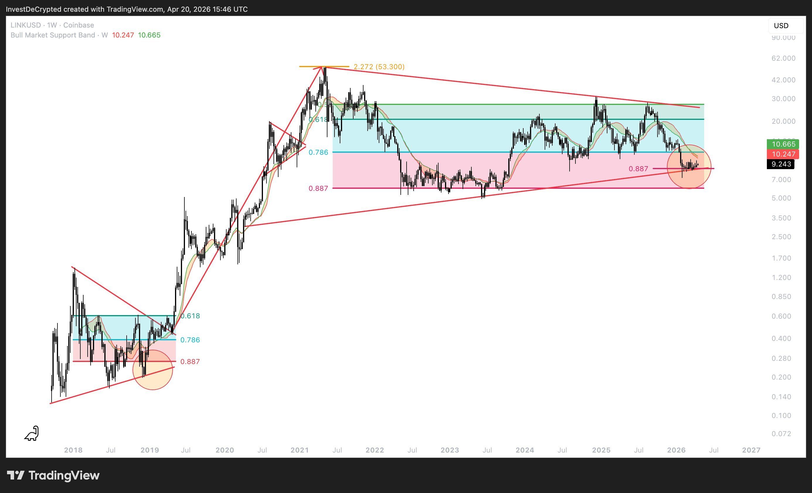 L’analista InvestDeCrypted traccia un ritracciamento di Fibonacci dal picco del 2021 a 53,30 dollari. L’attuale zona coincide con il livello 0,887, una fascia di supporto profondo che arriva fino a 7 dollari.