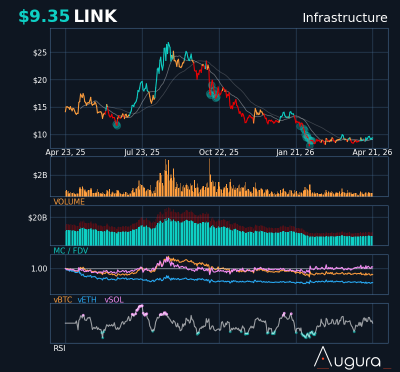Sul timeframe settimanale, LINK si trova a 9,24 dollari e scambia al di sotto della Bull Market Support Band. La banda si estende da 10,25 fino a 10,67 dollari come resistenza superiore.