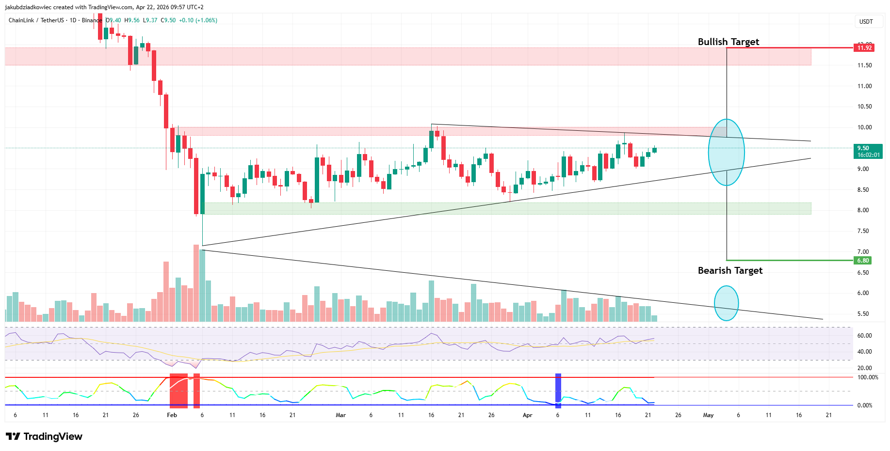 Il grafico giornaliero mostra un triangolo simmetrico in contrazione. Il supporto si trova vicino agli 8 dollari e le resistenze sono concentrate intorno ai 10 dollari. LINK ha una capitalizzazione di mercato di circa 6,8 miliardi di dollari in questo range.