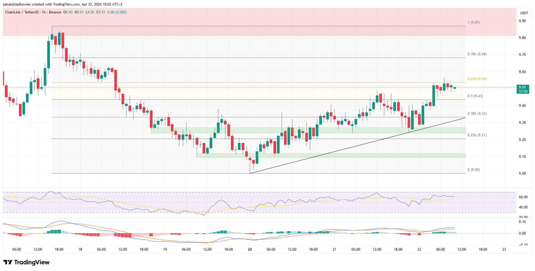 Nel frattempo, sul grafico a 1 ora LINK scambia a 9,51 dollari dopo aver toccato 9,54 dollari. Questo livello corrisponde al ritracciamento 0,618 del movimento da 9,87 a 9,00 dollari.