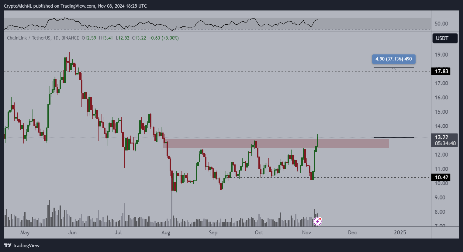 L’analista di cripto Michael van de Poppe ha previsto un forte rally in arrivo per Chainlink, alimentato dalla sua recente rottura sopra i 13,00 USD. Van de Poppe evidenzia che la lunga lotta di LINK per superare questo livello potrebbe ora essere terminata, aprendo la porta a una potenziale ascesa verso 17,83 USD. Tale salita rappresenterebbe un aumento del 37%, segnando guadagni sostanziali per i detentori di LINK.