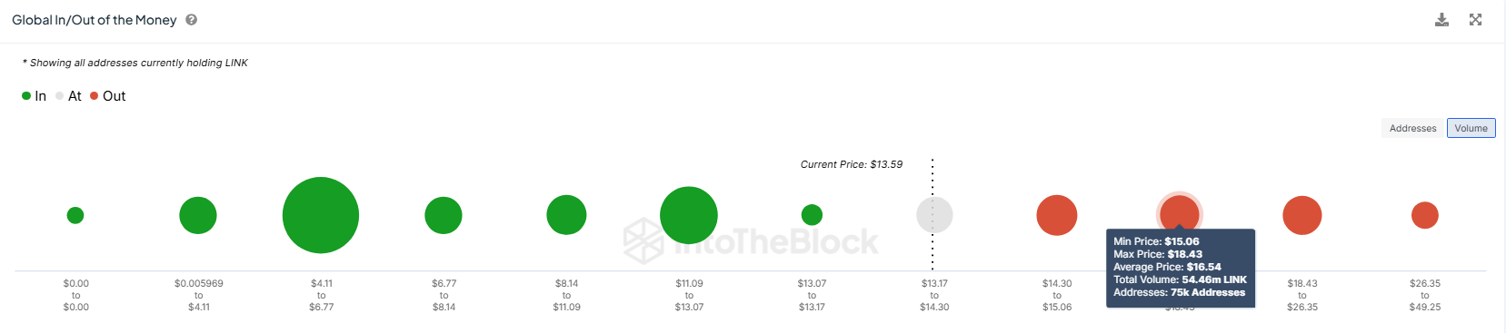 Il momento macro di Chainlink è ulteriormente supportato dal suo indicatore Global In/Out of the Money (GIOM). I dati GIOM rivelano che circa 120 milioni di token LINK, del valore di oltre 1,6 miliardi USD, sono stati acquistati tra i 14 USD e i 18,43 USD. Se il prezzo di Chainlink continua a salire, questa fornitura potrebbe diventare redditizia, alimentando ancora maggiore interesse per l’asset.